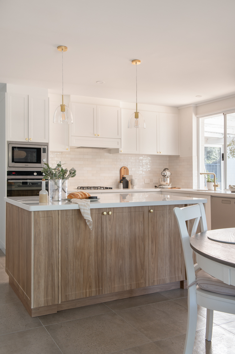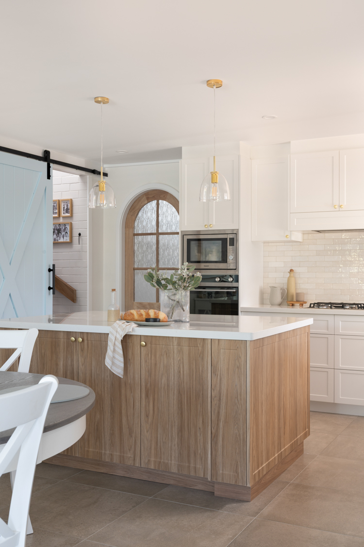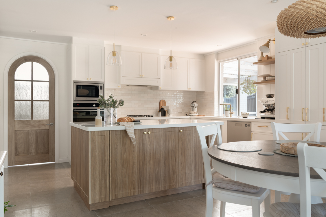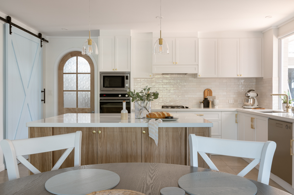 A classic Hamptons kitchen starts with shaker-style cabinetry. The defining feature of this cabinet style is the square panel framing each individual door, with this kitchen achieving the look using the Polytec Hampton profile in both Classic White and Prime Oak. Oak wood nods to the coastal and farmhouse influence and is also carried through in the stylish curved door frame. To complement this curved frame, other curved elements have been incorporated throughout the space such as the pendant lights, dining table, placemats and even the rounded cabinet handles!