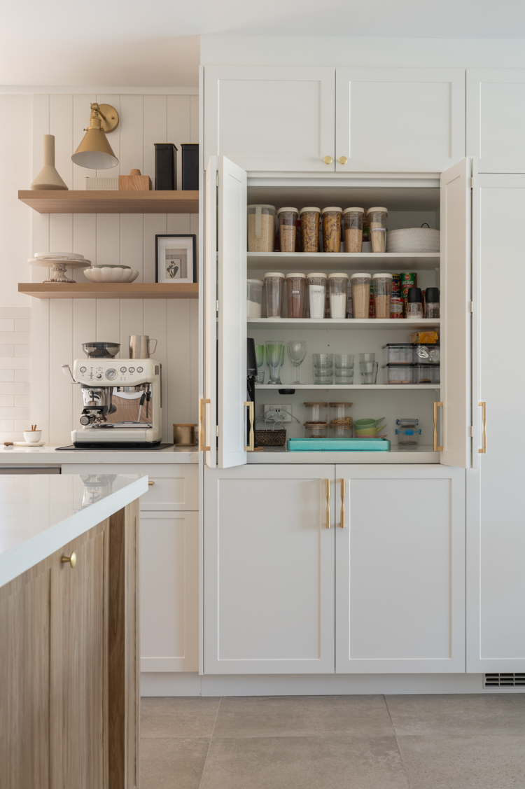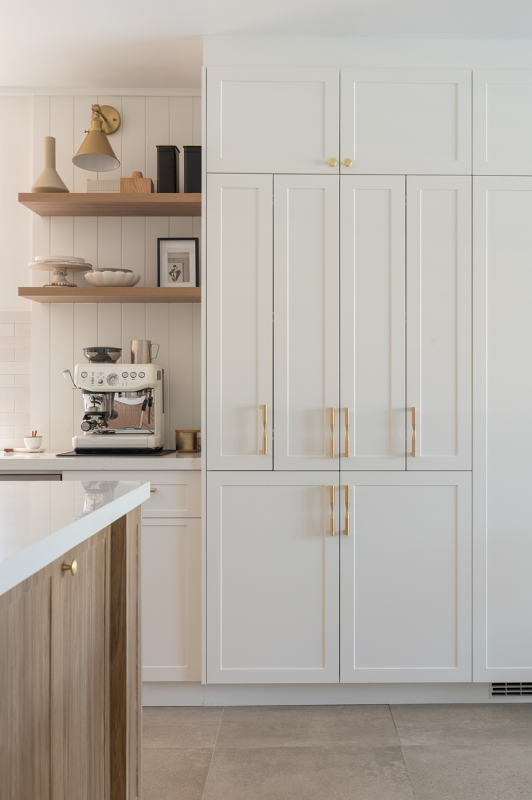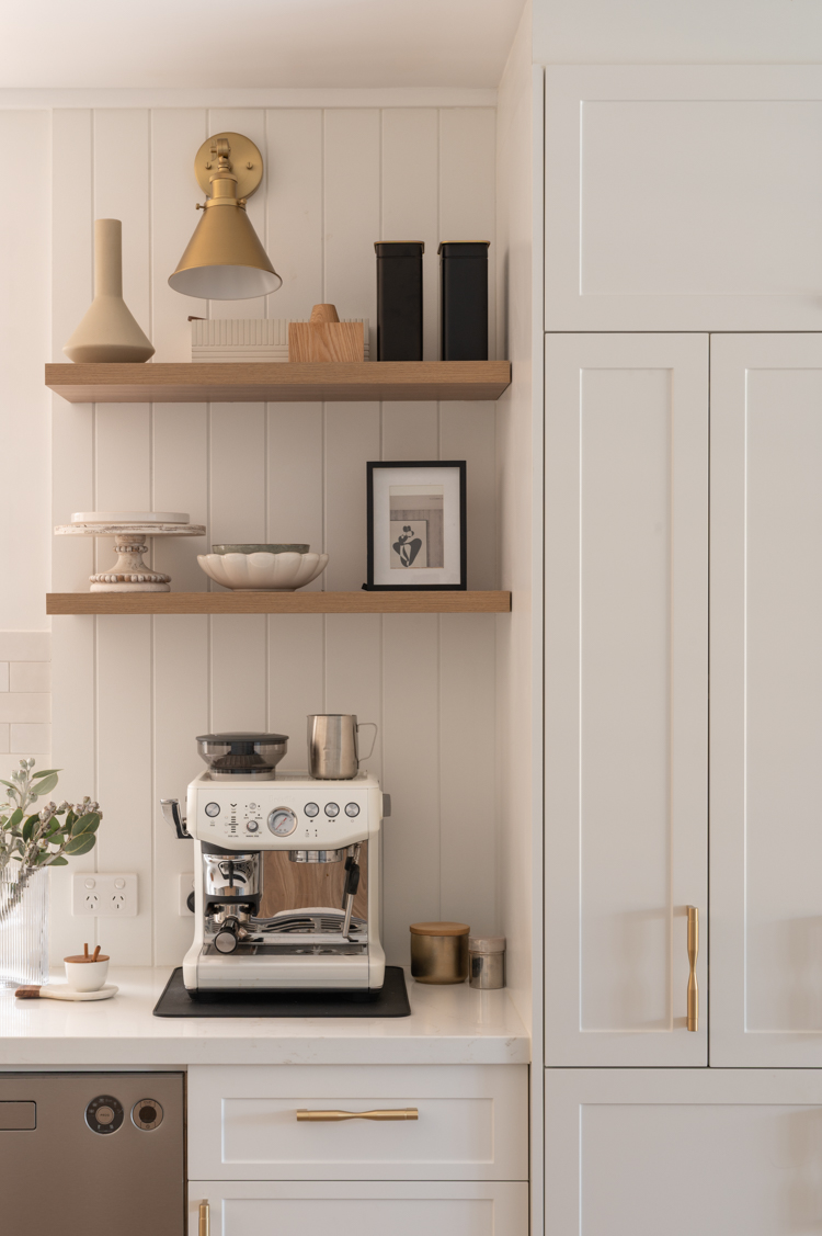One of the most charming areas of this kitchen is the coffee station with floating display shelves, or open shelving, above. It is the perfect way to add a personal touch to your space by displaying cookbooks, ceramics and those cute storage jars for your tea and coffee! We can see the designer had functionality in mind here, placing the most used appliances right near the fridge and pantry so essentials like milk and biscuits can be easily reached.