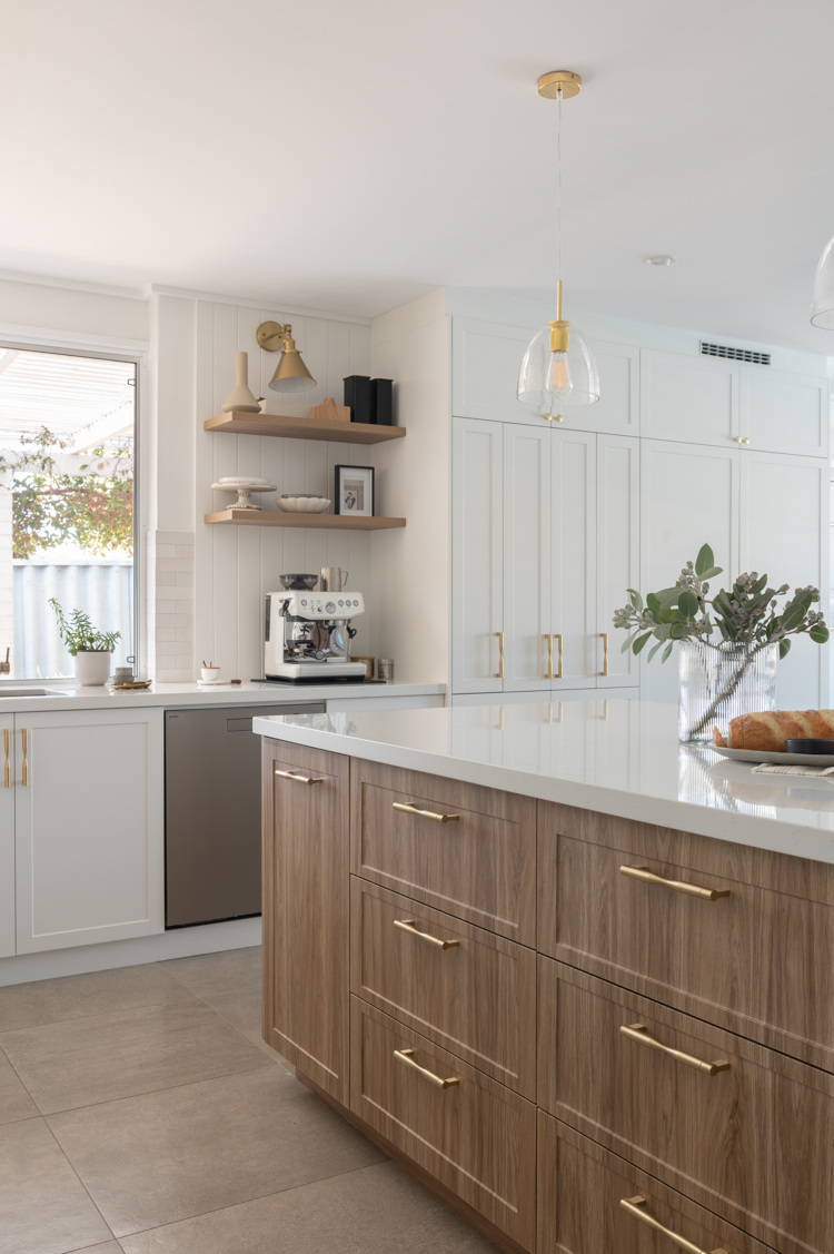 Brushed brass and polished hardware are staple elements of the Hamptons and farmhouse styles. They add a quiet luxurious feel without being overly flashy. Hafele brushed brass hardware was selected for this kitchen in a combination of round knobs and straight handles. But it doesn’t stop there, brass elements have also been weaved into the pendant lighting, sink tap and wall light above the open shelves.