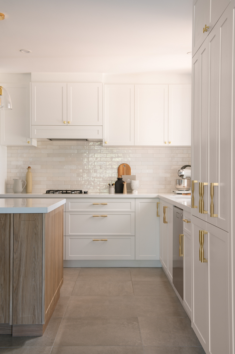 Hamptons style kitchens are traditionally characterised by their bright, airy colour palette and shaker-style cabinetry, which is that gorgeous, framed look you see on the doors and drawers. You’ll also find lots of creams, whites and blues, paired with marble benchtops and accents of natural timber. In terms of styling, pendant lighting, rattan or wooden barstools and polished hardware are all staple elements to achieve the quintessential Hamptons look you see in this gorgeous Karrinyup kitchen!